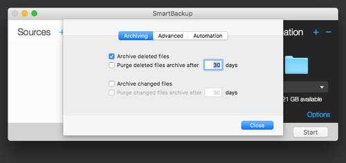 Each destination has configurable "Options" which are accessible via the "Options" button. The options panel allows you to configure Automation (please see the Automation section for details), Archiving options (please see the Archiving Options section for details) and "Advanced" options. You should not have to modify the defaults configured under "Advanced" unless you do something specific like debugging a sync using extended logging, changing the number of parallel copies (please see the "copy threads" section for details) or require pre-allocation for Xsan/Stornext volumes.